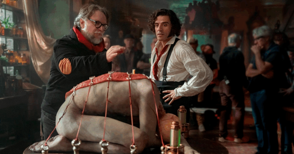 De fato, o ponto alto é seu visual estonteante. É aqui que mora a paixão de Guillermo del Toro. Vemos as origens de todos os seus monstros de longas anteriores, como “O Labirinto do Fauno”, “A Forma da Água” e até dos menos góticos, como “Hellboy”. Cada aspecto de cena e design de produção é feito para dialogar com o tema mórbido e de natureza moralmente ambígua.